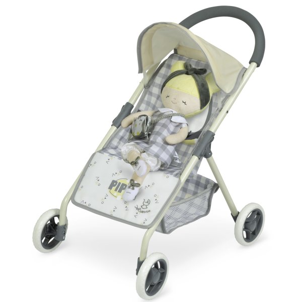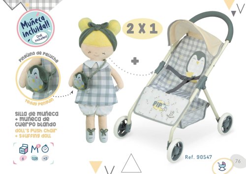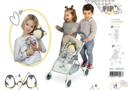 DeCuevas 90547 Sportovní kočárek pro panenky a plyšová panenka PIPO 2022 - 55 cm, ze stejnojmenné kolekce, která je novinkou roku 2022, je díky nízké rukojeti a váze spíš vhodný pro malé a menší slečny. Kolekce nabízí krom různých druhů kočárků a nábytku pro panenky i další doplňky pro budoucí hospodyňky. Charakteristická je pro tuto kolekci šedobílá kostka v kombinaci s jednobarevnými šedivými a bílými drobně vzorovanými částmi a doplňky v jemně žluté barvě a již zmíněným tučňákem PIPO. Nádherný španělský design, precizní zpracování. Skládací model, velmi snadná manipulace během samotné hry. Materiál: kov, plast, textil. Baleno v krabici v barvách kolekce. Doporučený věk od 3 let.