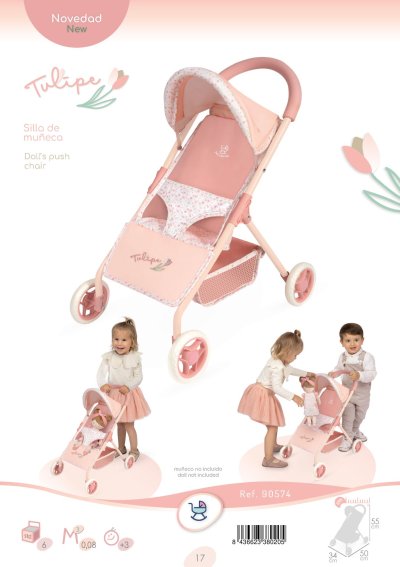 DeCuevas 90574 Sportovní kočárek pro panenky Tulipe 2025 - 55 cm patří do stejnojmenné kolekce, která je novinkou roku 2025 a nabízí výběr výrobků od jídelních sad přes postýlky a kočárky až po dřevěný nábytek pro panenky. Tulipe je, jak již sám název napovídá, kolekce plná tulipánů v překrásně sladěných teplých pastelových lososových barvách. Světlejší a tmavší odstíny barev jsou vkusně doplněné drobným květinovým vzorem ve stejných tónech na bílosmetanovém podkladu. Tento motiv ještě navíc u kočárků umocňují svým tematickým tvarem i překrásné, jako tulipán vypadající tašky. Květ tulipánu zdobí i dřevěné výrobky této kolekce.