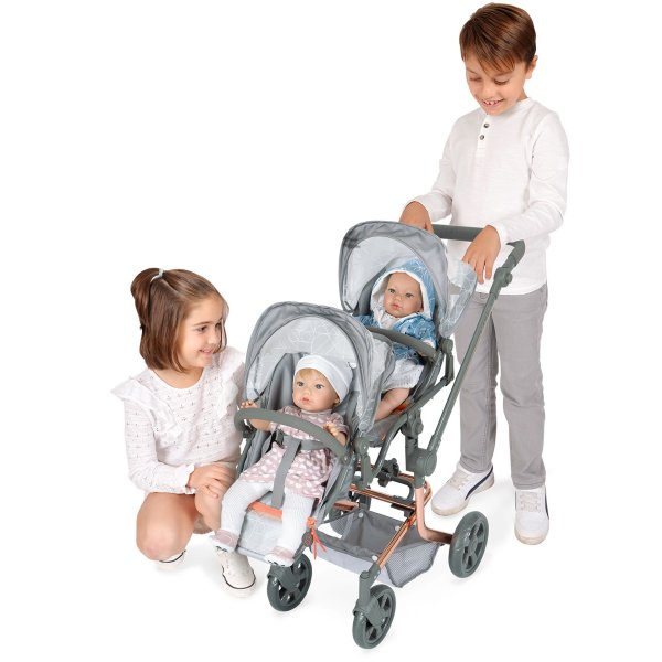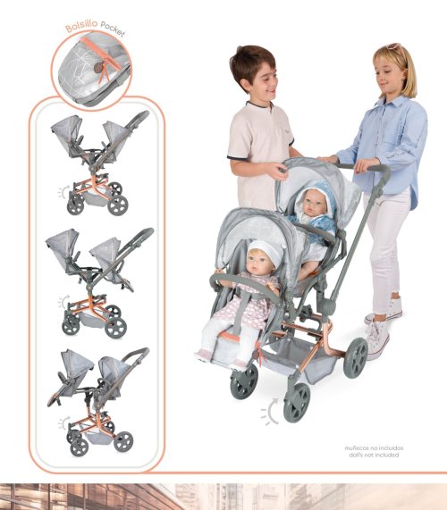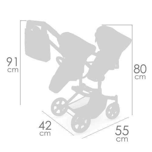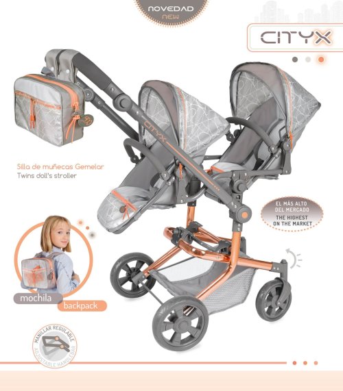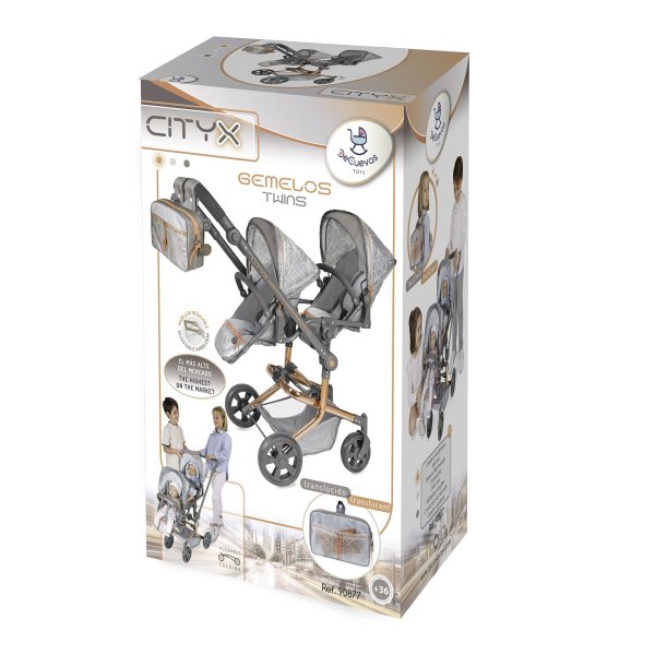 DeCuevas 90877 Skládací kočárek pro dvojčata panenky s batůžkem CITY X - 91 cm patří do stejnojmenné kolekce, která je novinkou roku 2024 a nabízí několik různých druhů kočárků. Supermoderní kolekce CITY X představuje kombinaci nevšedních materiálů. Standardní látky jsou doplněny o designově zpracovaný materiál PVC s potiskem, jež vytváří efekt skleněných ploch, které do dnešních moderních měst patří. Celou tuto stříbrošedou kolekci zdobí prvky v trendy měděné barvě, která podtrhuje lehkost a vzdušnost celé výjimečné kolekce.Doplňky a vybavení:• 2 odnímatelné anatomicky tvarované korbičky s možností umístění ve směru i proti směru jízdy • Tříbodový pásový systém pro uchycení panenky• Průsvitné kapsy se zipem na korbičkách• Moderní batůžek na kočárek nebo na záda s průsvitnou kapsou • Úložný prostor v dolní části kočárku• Otočná přední kolečka pro snadnější jízdu• Výškově nastavitelná rukojeť, výška: 61 - 91 cm • Rozměry kočárku: 55 × 42 × 91 cm (výška k rukojeti v nejvyšší poloze)• Vnitřní rozměr korbičky: 49 x 22 cm (d x š)• Do korbičky lze posadit panenku až do velikosti 52 cm• Panenky nejsou součástíDoplňující informace:• Nádherný španělský design• Precizní zpracování• Skládací model• Velmi snadná manipulace během samotné hry• Materiál: kov (chrom a hliník), plast, textil• Baleno v krabici v barvách kolekce• Rozměry balení: 63 x 27 x 40,5 cm (d x š x v)• Váha balení: 4,5 kg• U vybraných modelů je na obalech QR kód s video návodem na sestavení• Doporučený věk od 3 letDeCuev