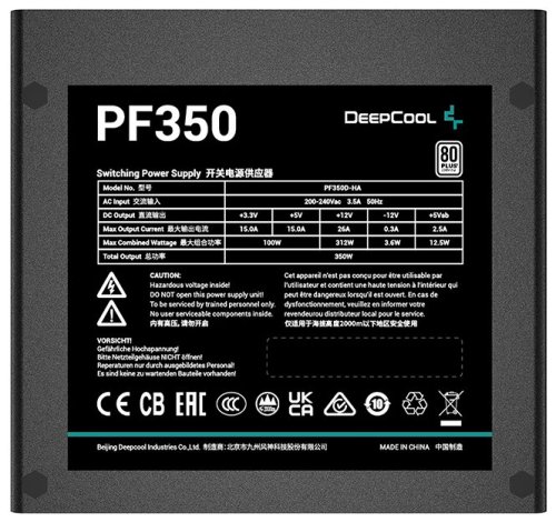 DEEPCOOL PF350 350 W; Napájecí zdroj osazen tichým 120 mm ventilátorem. Účinnost zdroje splňuje certifikaci 80PLUS Standard.