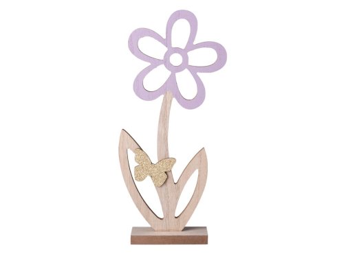 Dřevěná dekorace ve tvaru kytky s motýlem, v přírodní růžové barvě s glitrem. Ideální pro ozdobení interiéru a vytvoření jemné atmosféry. Její velikost je 140x305mm.