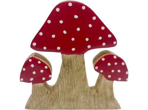 Sada dřevěných hub v podobě muchomůrek s červeným kloboučkem. Stojící dekorace vhodná na poličku, okenní parapet nebo sváteční stůl. Podzimní klasika v přírodním duchu.