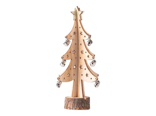 Dekorace dřevo 105x190mm,stromek na postavení s rolničkami, přírodní