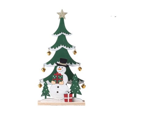 Dekorace dřevo 110x225mm,stromek na postavení s rolničkami a sněhulákem, zelená, bílá s glitrem