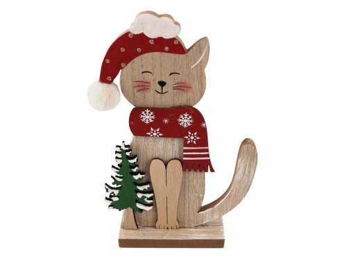 Dekorace dřevo 140×215 mm, kočka na postavení, přírodní, červená