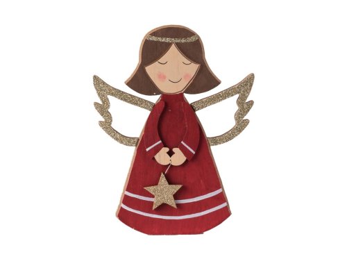 Dekorace dřevo 150x195mm, anděl na postavení, červená s glitrem