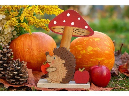 Dekorace dřevo 150X205mm muchomůrka s ježkem, přírodní, červená, bílá, hnědá