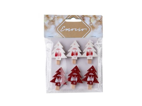 Dekorace dřevo 6 ks 50x36 mm stromek na kolíčku, bílá, červená