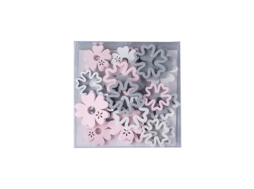 Dřevěná dekorace ve tvaru kytičky, dostupná v několika barvách. Její rozměry jsou 35 x 35 mm a 27 x 27 mm. Zboží je dodáváno v mixu. Doručované zboží je vybíráno náhodně a nelze vybrat konkrétní provedení.