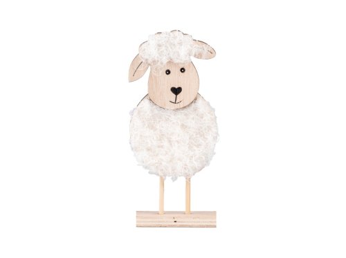 Dekorace dřevo, textil 75x165mm ovečka na postavení, přírodní, bílá