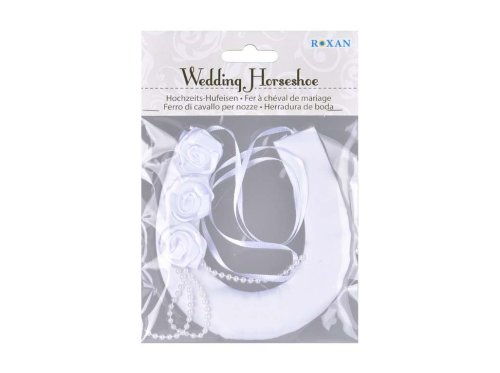 Elegantní svatební dekorace ve tvaru podkovy, která přináší štěstí a krásně doplní svatební výzdobu. Její rozměry jsou 110 x 120 mm.