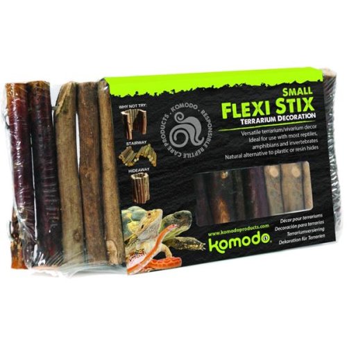 Variabilní přírodní dekorace vhodná pro většinu plazů, obojživelníků i bezobratlých. Dřevěné špalíčky navléknuté na ohebných drátech tvoří všestranně použitelný, snadno tvarovatelný prvek, z něhož lze vyrobit úkryt, most, přístupovou cestu nebo vyhřívací plošinu. Flexi Stix lze použít i v ubikacích drobných savců. Rozměry: cca 21 × 10 × 1,5 cm Materiál: dřevo, kovový drát Upozornění: Výrobek pravidelně kontrolujte a poškozený nebo příliš rozpraskaný dále nepoužívejte. Tvar, vzhled a rozměry jsou u každého výrobku mírně odlišné.