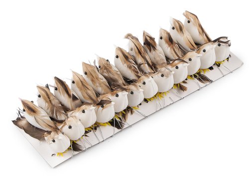 Dekorační ptáček je vyrobený z plastu a jeho tělo pokrývá barevné peří. Na nohách má připevněné dva kovové drátky, díky kterým můžete ptáčka připevnit například na věnec, větvičku, záclonu či ho naaranžovat do květinových vazeb. Ptáčci po 24 kusech jsou baleni v papírové krabici.
