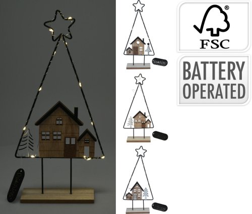 Dekorace STROM S DOMEČKEM 10LED, 39 cm, kov / dřevo.