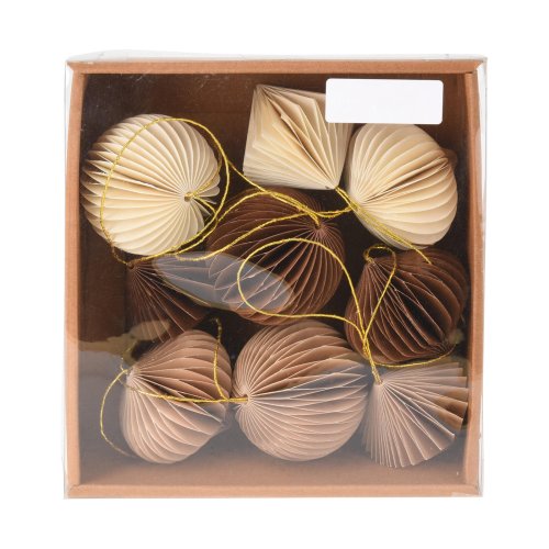 sada obsauje 9 ks mix druhů: koule, cibule, diamant velikost: 6 cm materiál: papír mix barev: béžová, světle hnědá, hnědá