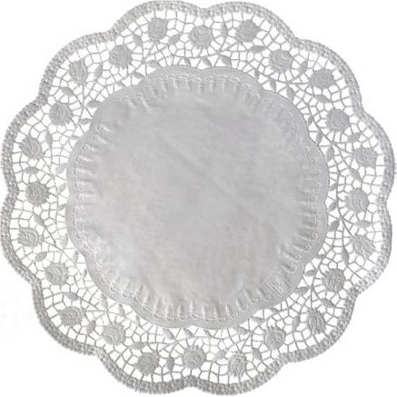 Dekorativní krajka kulatá, bílá. Průměr 18 cm, balení 100 ks.