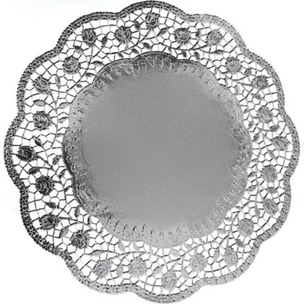 Dekorativní krajka kulatá, stříbrná. Průměr 36 cm, balení 4 ks.