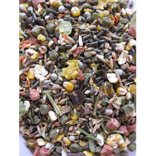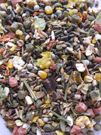 Složení: vojtěška (22 %), pšeničné otruby, hrachové vločky, slunečnicový šrot, extrudovaná kukuřice, rohovník, sójové slupky, řepkový šrot, kukuřičné vločky, timotejové seno (3 %), vojtěšková sláma (2,5 %), pšenice pufovaná, sušená mrkev ( 2 %), pufovaná kukuřice, extrudovaná pšenice, ovesné slupky, slunečnicová semena, hrách, kukuřičný škrob, sójová mouka, extrudovaný ječmen, melasa (cukrová) řepa, uhličitan vápenatý, slunečnicový olej, sušený banán (0,3 %), kukuřičné klíčky, sušené jablko (0,2 %), chlorid sodný, fosforečnan vápenatý, sušená červená řepa (0,1 %), fosforečnan vápenatý, extrudovaná rýže.