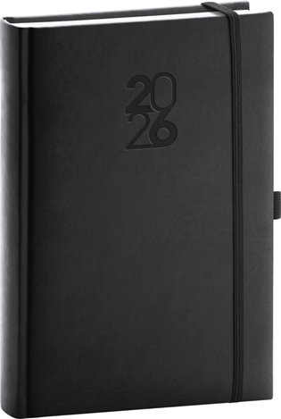 Denní diář Aprint Top 2026 v černé barvě. Rozšíření oblíbené řady Aprint o variantu s gumičkou na zavírání a poutkem na tužku. Denní rozvrh s česko-slovenským kalendáriem a doplňkovou angličtinou, němčinou, maďarštinou a ruštinou.