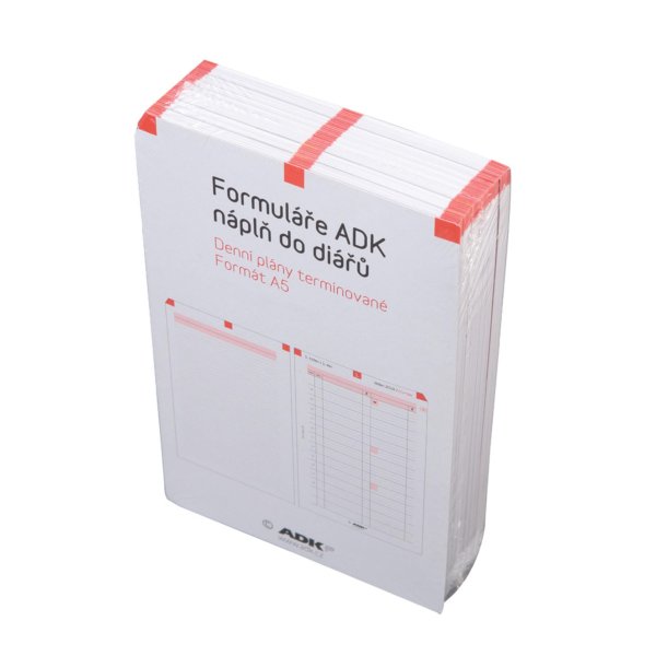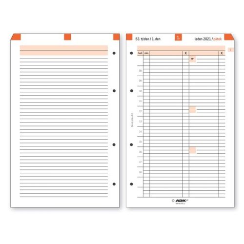 Každý den na jeden list (1.strana rozdělena po hodinách, 2.strana - volné řádky na poznámky)