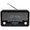 DAB+/FM rádio s funkcí RDS Pamět na 10 stanic DAB+ a 10 stanic FM Bluetooth Stereo digitální zvuk LCD displej Datum, hodiny, budík Buzení rádiem, nebo tónem Nastavení buzení denně | jednou | víkendy | všední dny Výkon reproduktorů: 2 x 2 W Dřevěný korpus AUX vstup pro připojení MP3 přehrávače atd. Teleskopická anténa Napájení ze sítě 230V, nebo 4 x baterie typu C (baterie nejsou součástí dodávky) Rozměry: 21,6 x 11,3 x 14,8 cm (šxhxv)