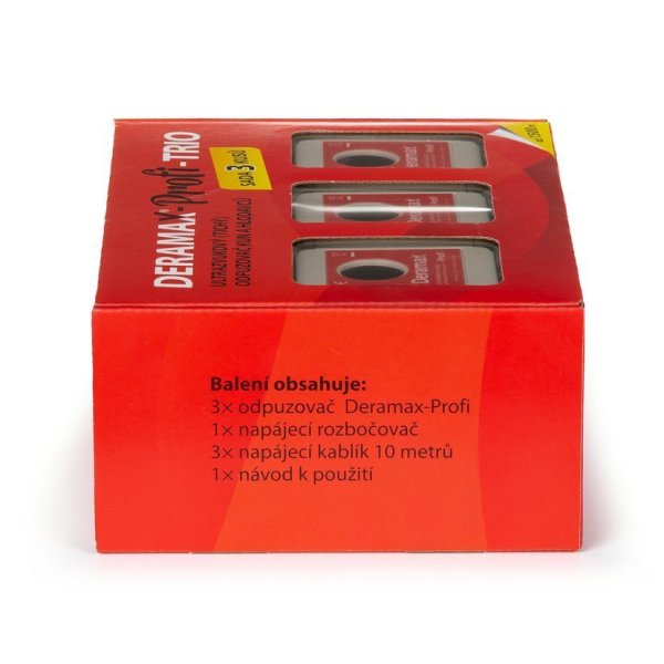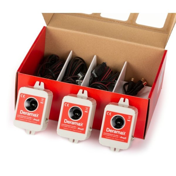 Sada Deramax-Profi-Trio se skládá ze 3 ks plašičů Deramax-Profi, které se připojují k centrálnímu napájecímu rozbočovači pomocí 10 metrů dlouhých prodlužovacích kablíků. Rozbočovač slučuje všechny prodlužovací kablíky a připojuje je k centrálnímu napájecími zdroji (zdroj není součástí dodávky).