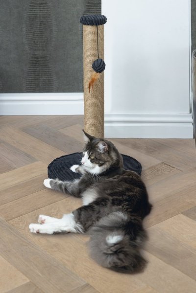 Toto škrabadlo bude nejen užitečné pro Vaši kočku a péči o její drápky, ale bude také vypadat skvěle ve Vaší domácnosti. Základna je potažena luxusní žebrovanou tkaninou, ve které jsou vyvedeny i další detaily. Škrabací sloupek je omotán jutovým lanem. Zde Váš mazlíček může svisle škrábat do sytosti a Váš nábytek tak už nebude sloužit jako škrabadlo. Díky zavěšené hračce ve formě míčku s pírkem je škrabadlo i neodolatelně zábavné. Zkrátka - s tímto škrabadlem uděláte radost sobě i své kočce.