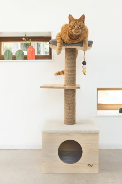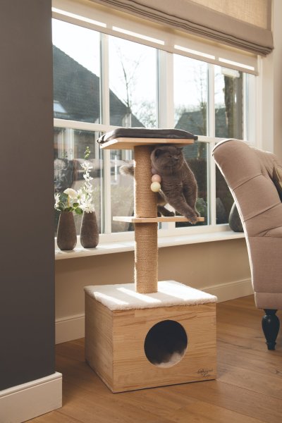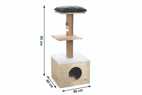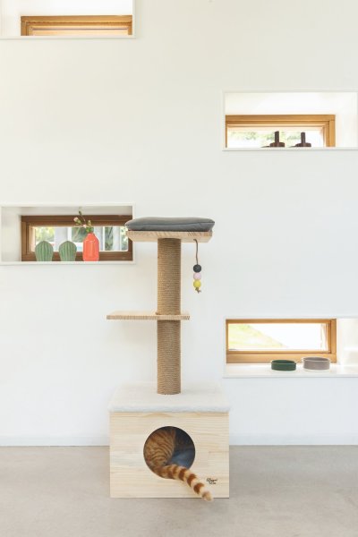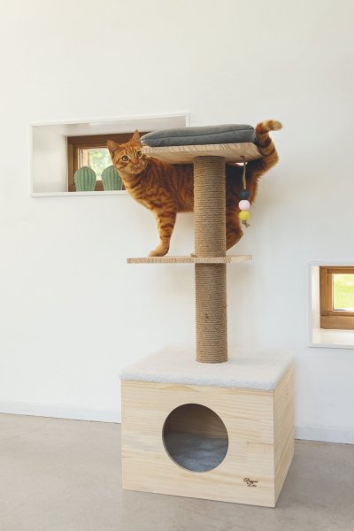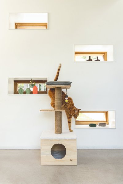 Lezení, protahování, broušení drápků, hraní nebo zdřímnutí? To vše je možné se škrabadlem Kamina od Designed by Lotte. Vršek domečku je opatřen měkkou dečkou a na horní plošině najdete polštářek. Zde si Vaše kočka může zdřímnout nebo jen na vše v klidu dohlížet. Ve spodní části sloupku je útulný domeček pro pohodlný a ničím nerušený odpočinek. Škrabací sloupek je omotán sisalovým lanem, takže Váš mazlíček může uspokojit svou přirozenou potřebu škrábání do sytosti. Součástí je také hračka ve formě zavěšených míčků.