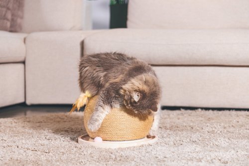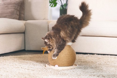 Řekněte - co může být pro Vaši kočku zábavnější než hraní a škrábání zároveň? Obojí je možné s hračkou Mila od Designed by Lotte. Nabízí kulatou základnu z kaučukového dřeva se štěrbinou a míčky. Jakmile se Vaše kočka dotkne míčků čumáčkem nebo tlapkou, začnou se ve štěrbině kutálet. Je Váš chlupatý mazlíček dostatečně rychlý, aby všechny následoval? Do této herní základny je zasazena škrabací koule, omotaná jutovým provazem. Zde si Vaše kočka může brousit drápky dle libosti a pečovat o ně. Třešničkou na dortu jsou pírka na lanku, takže extra zábava může začít!