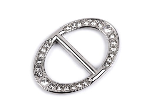 Kovová spona je osázená třpytivými broušenými kamínky, díky kterým působí elegantně. Vynikne jako ozdoba plesových a večerních šatů nebo doplňků (psaníček, kabelek apod.). Je vhodná na výrobu tenkých pásků.
