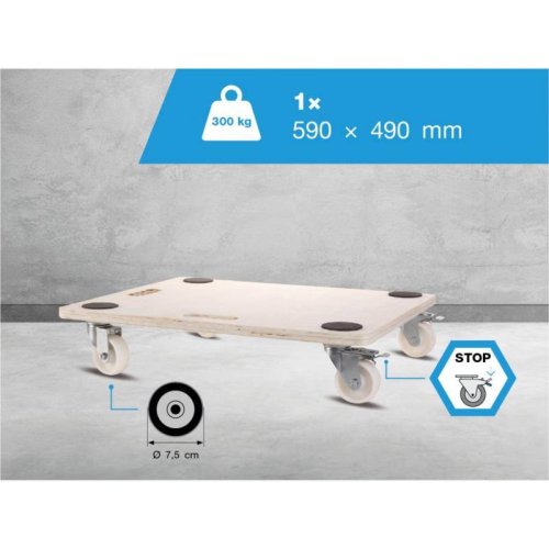 Rozměry: 59 x 49 cm Materiál: přírodní překližka Tloušťka desky: 18 mm Protiskluzové podložky Průměr kolečka: 75 mm, 2x kolečka s brzdou Nosnost: 300 kg Vhodná pro měkké podlahy FSC®? certifikovaný …