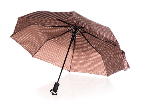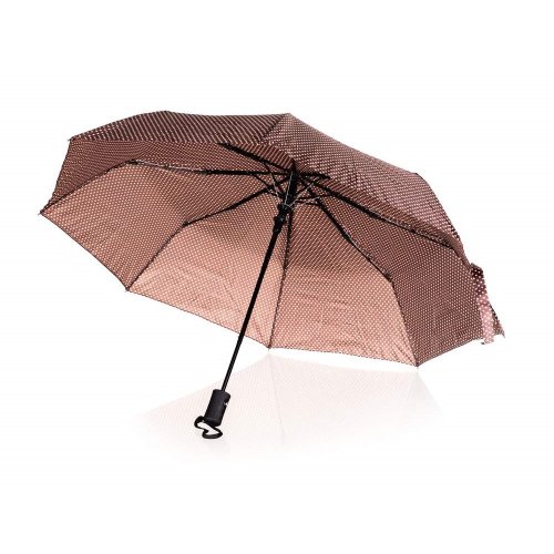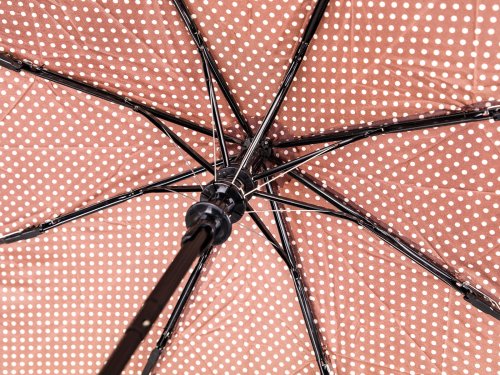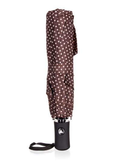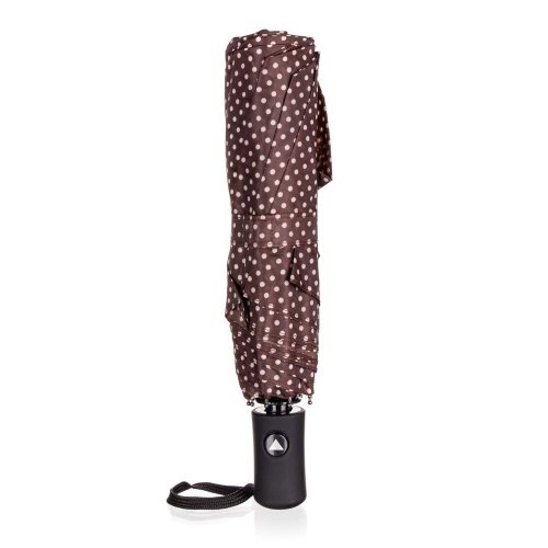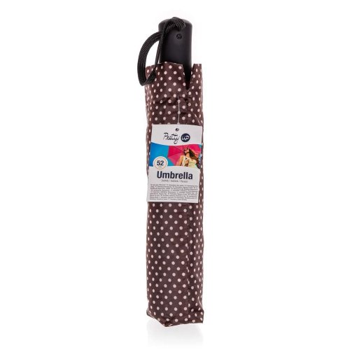 Deštník skládací 52 cm v hnědé barvě s puntíky, slouží k ochraně proti dešti a přímému slunci. Je vyroben z nepromokavého materiálu polyester. Má ochranu proti poškození větrem, automatické otevíraní a je skládací pro snadné uskladnění.