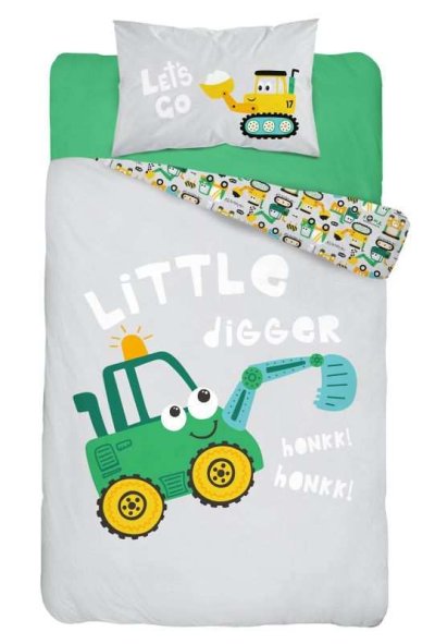 DETEXPOL Povlečení do postýlky Bagr zelený 100/135, 40/60 Dětské bavlněné povlečení do postýlky, motiv peřiny je z každé strany jiný, zapínání na zip, praní na 40°C Materiál: 100% Bavlna Rozměr: 1x 100/135, 1x 40/60 cm