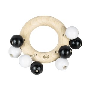 Dřevěné chrastítko s pandou v moderní černo/bílé kombinaci barev.