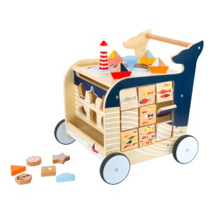 Rozměry chodítka: 33x47,5x40 cm Rozměry balení: 48x36x10 cm Věk: 12m+ Materiál: dřevo, guma, kov Obsahuje 13 dílů