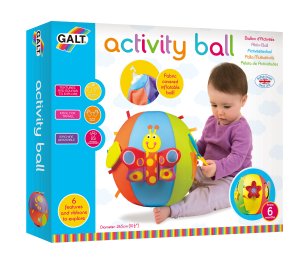 Na míči je připevněno 6 druhů aktivit pro děti a barevné pásy po stranách.