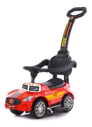 Červené autíčko s vodící tyčí pro děti, které již samostatně sedí.