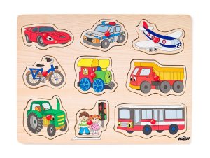 Puzzle WOODY Puzzle Dopravní prostředky Jednotlivé dopravní prostředky se za pomoci úchopů vkládají do příslušných otvorů 9 dílků Věk 2+ Rozměr 30 x 21 cm