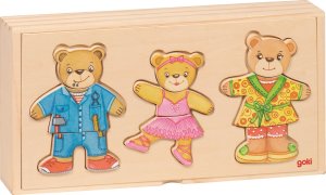Oblíbená dřevěná "oblékací" skládačka se spoustou oblečení nazývaná též Šatní skříň pro malé děti s tříčlenno medvědí rodinou.