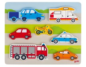 Barevná dětská vkládačka s devíti dopravními prostředky.