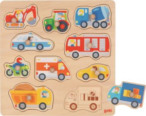Barevná dětská vkládačka s dopravními prostředky, technickými a záchranářskými vozidly.