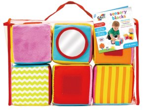Šest látkových kostek s molitanovou výplní s různými texturami pro cvičení vnímání a stranami opatřenými suchým zipem, který umožní kostky různým způsobem připojovat k sobě.
