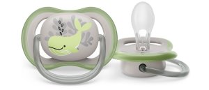 Šidítko se standardním štítkem, svítící disk a tečky usnadňují nalezení šidítka ve tmě.