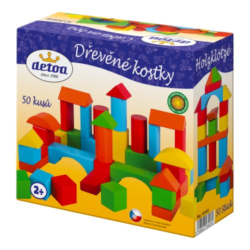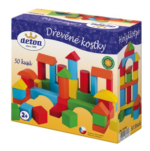 Barevná stavebnice osahuje 50 kusů dřevěných kostek různých tvarů. Válečky-5,5x2,5 cm, kvádry- 5,5x2,5 cm, krychle -2,5x2,5 cm. Nevhodné pro děti do 2 let. Obsahuje malé části. Hlavní vlastnosti: stavebnice pomáhá rozvíjet dětskou představivost a motoriku rukouvýrobek splňuje požadavky EU na bezpečnost hraček vhodný pro děti od 2 let