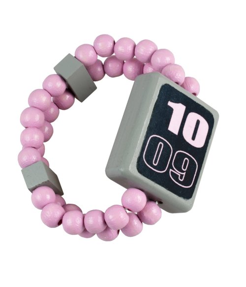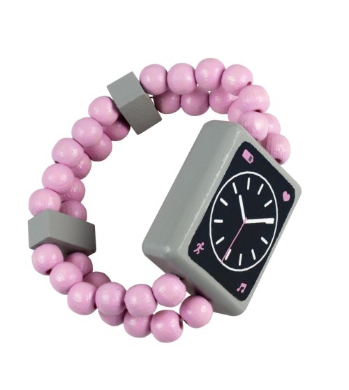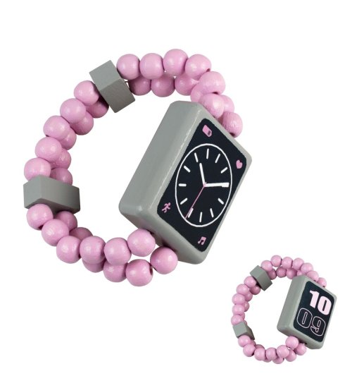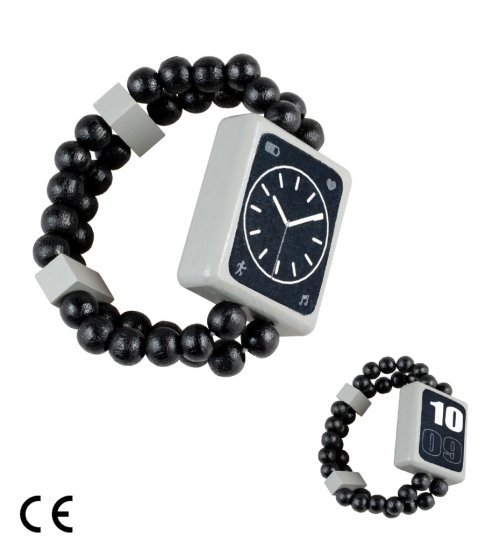 Oboustranné dřevěné hodinky s obrázkem digitálních a ručičkových hodin. Navlečeno na jemné gumičce. Hlavní vlastnosti: pěkný doplňeknevhodné pro děti do 3 let, obsahuje malé částidřevěná hračka splňuje všechny normy EU