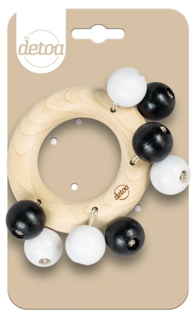 Dřevěné lehké chrastítko s černobílými kuličkami na šňůrce pomáhá rozvíjet jemnou motoriku rukou a je vhodné pro děti od 6ti měsíců. Výrobek splňuje požadavky EU na bezpečnost hraček. Průměr kroužku je 7 cm a je připevněn na ekologické papírové kartě. Hlavní vlastnosti: procvičuje jemnou motorikuvýrobek je zdravotně nezávadnýsplňuje všechny normy EU pro bezpečnost hračekprůměr kroužku je 7 cm a je připevněn na papírové kartěvyrobeno v České republice