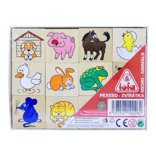 Dřevěné pexeso s obrázky zvířátek pro procvičení soustředění a paměti. Hra obsahuje 24 kusů o velikosti 40 x 40 x 5 mm. Baleno v krabičce z tvrdého papíru. Nevhodné pro děti do 3 let. Obsahuje malé části. Výrobek je zdravotně nezávadný.