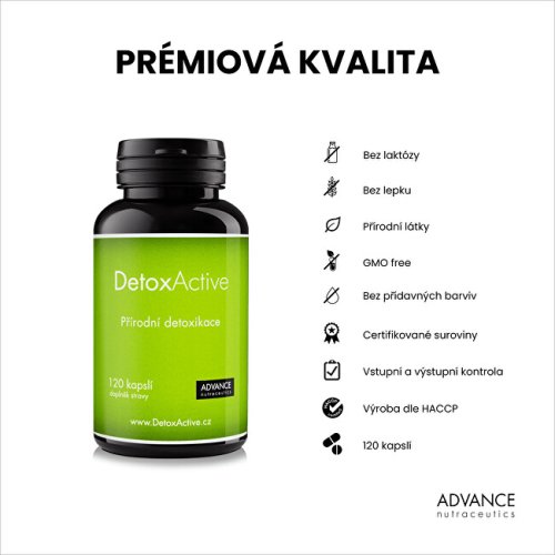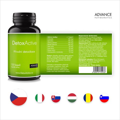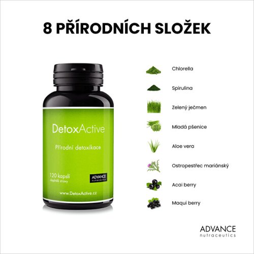 DetoxActive je doplněk stravy ve formě kapslí obsahující unikátní kombinaci přírodních látek, které podporují detoxikaci organismu - chlorellu, spirulinu, zelený ječmen a mladou pšenici s extrakty acai, maqui berry, aloe vera a ostropestřce mariánského.
