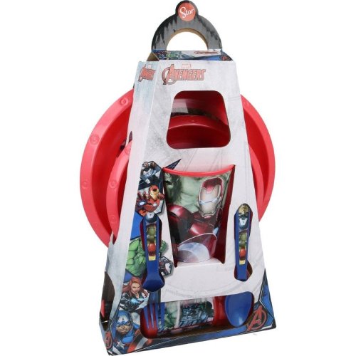 Šestidílná sada dětského nádobí z plastu. Obsahuje misku, talíř a sklenici o objemu 260 ml, dále hlinikovou láhev a příbor.