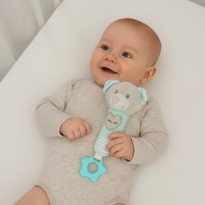 Chrastítko má zajímavé tvary a výrazné barvy, které přitahují pozornost dítěte. Obsahuje zvukové prvky jako pískátko a chrastítko, ale také kousátko, které ulevuje během růstu zoubků. Hračka tak nejen baví, ale také podporuje rozvoj koordinace zraku a pohybu, sluchu a hmatu.